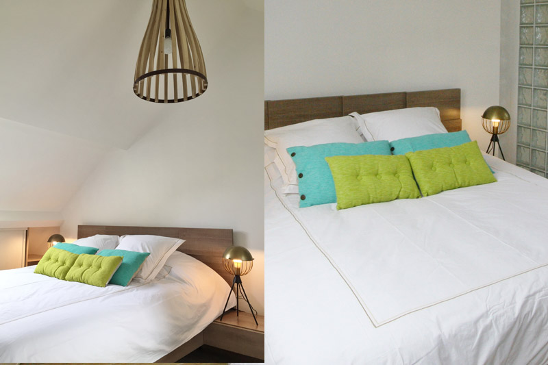 Top floor of the duplex, in the attic area : large suite with a 180 cm bed and a shower room.