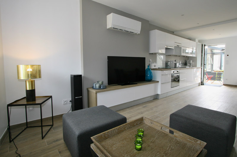 On the top floor, accessible by lift and then a private staircase, this duplex of 50 m² has a living room with a fully equipped kitchen, a sitting area (sofa that can turn into a 140 cm bed) and a private terrace.